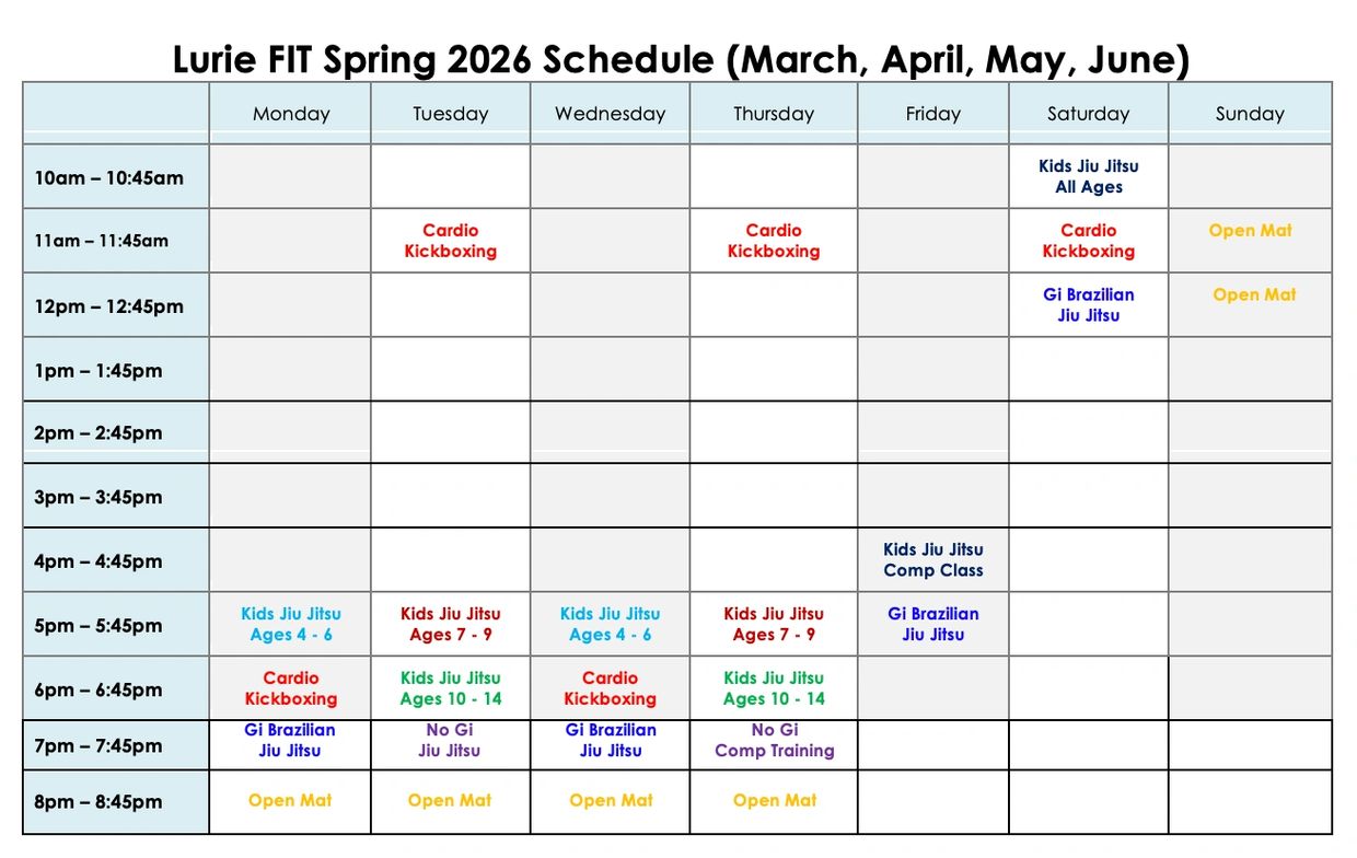 Lurie Fit University (LFU) is the PREMIER Fitness University on long Island that specializes in Brazilian Jiu Jitsu and Cardio Kickboxing. We are a completely beginner friendly team and family based academy with fitness for all levels. With our 45 minute Brazilian Jiu Jitsu and Cardio Kickboxing Classes you are sure to be learning and progressing in every avenue of your Martial Arts/Fitness Journey.